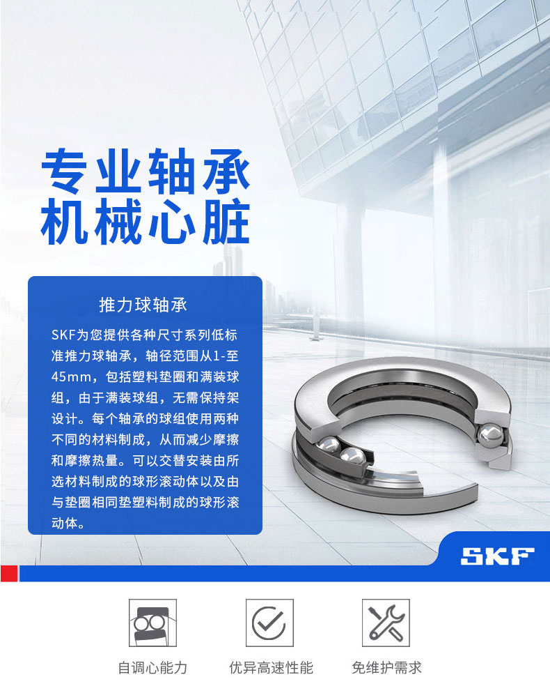SKF推力球轴承是一种分离型轴承,轴圈、座圈可以和保持架、钢球的组件分离。轴圈是与轴相配合的套圈,座圈是与轴承座孔相配合的套圈,和轴之间有间隙;推力球轴承只能够承受轴向负荷,单向推力球轴承是只能承受一个方向的轴向负荷,双向推力球轴承可以承受两个方向的轴向负荷;推力球轴承不能限制轴的径向位移,极限转速很低,单向推力球轴承可以限制轴和壳体的一个方向的轴向位移,双向轴承可以限制两个方向的轴向位移。